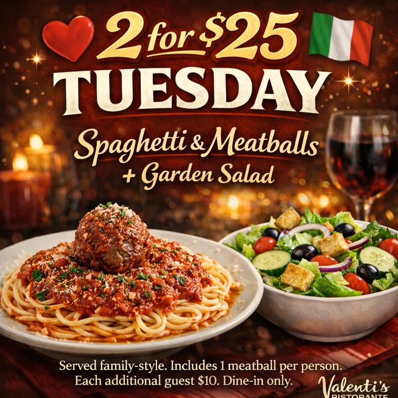 Enjoy the best of Valenti's from the comfort of your home. Our full menu is available online for pickup, making it easier than ever to satisfy your cravings. Simply place your order, and we'll have everything prepared fresh and ready for you.
